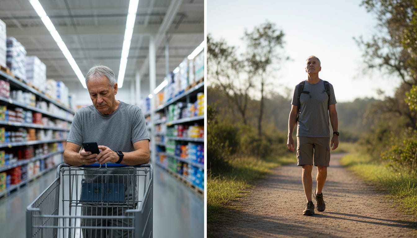 You can hit 10,000 steps shuffling around Target, hunched over your cart, breathing shallow, stress cortisol pumping through your system because you’re trying to “get your steps in” before closing time.