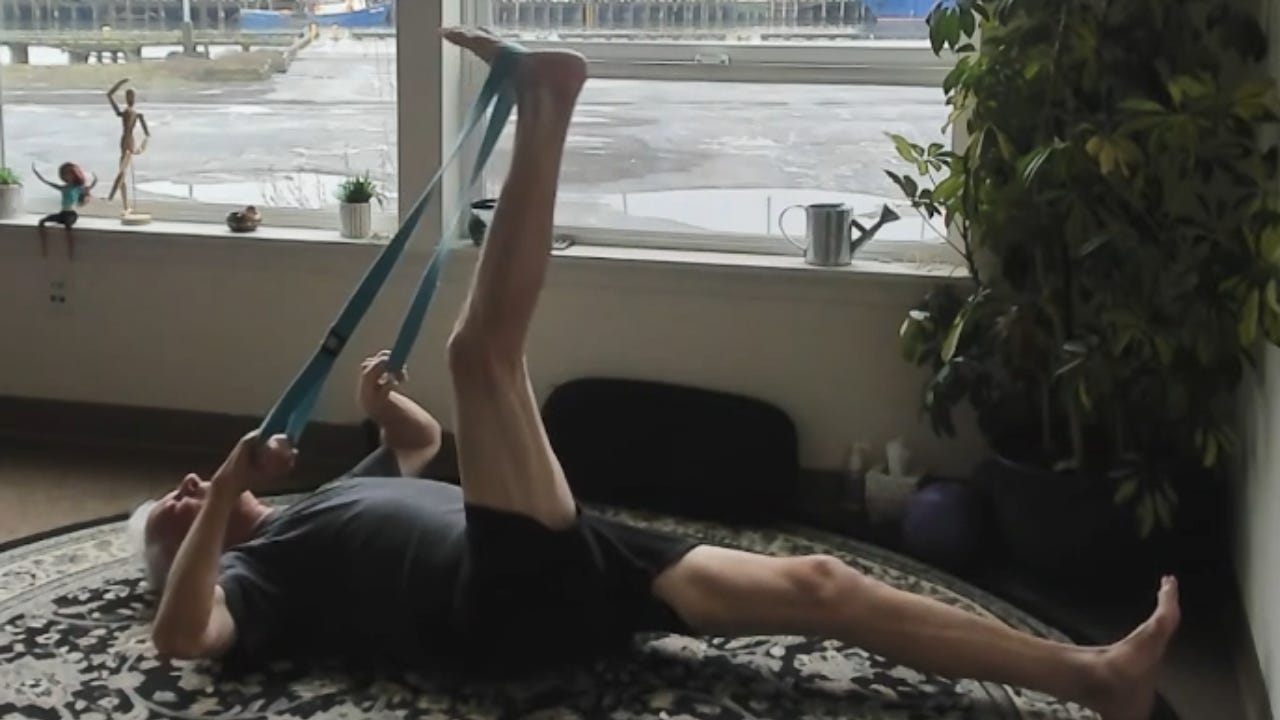 Our go-to daily demo is the supine hamstring resistance stretch with a long strap. It’s accessible, floor-based, and works beautifully whether you’re 40 or 80.